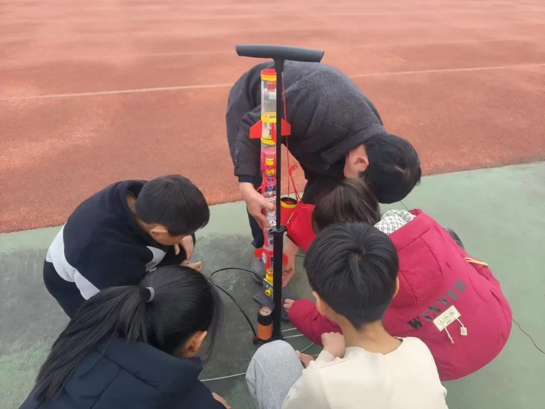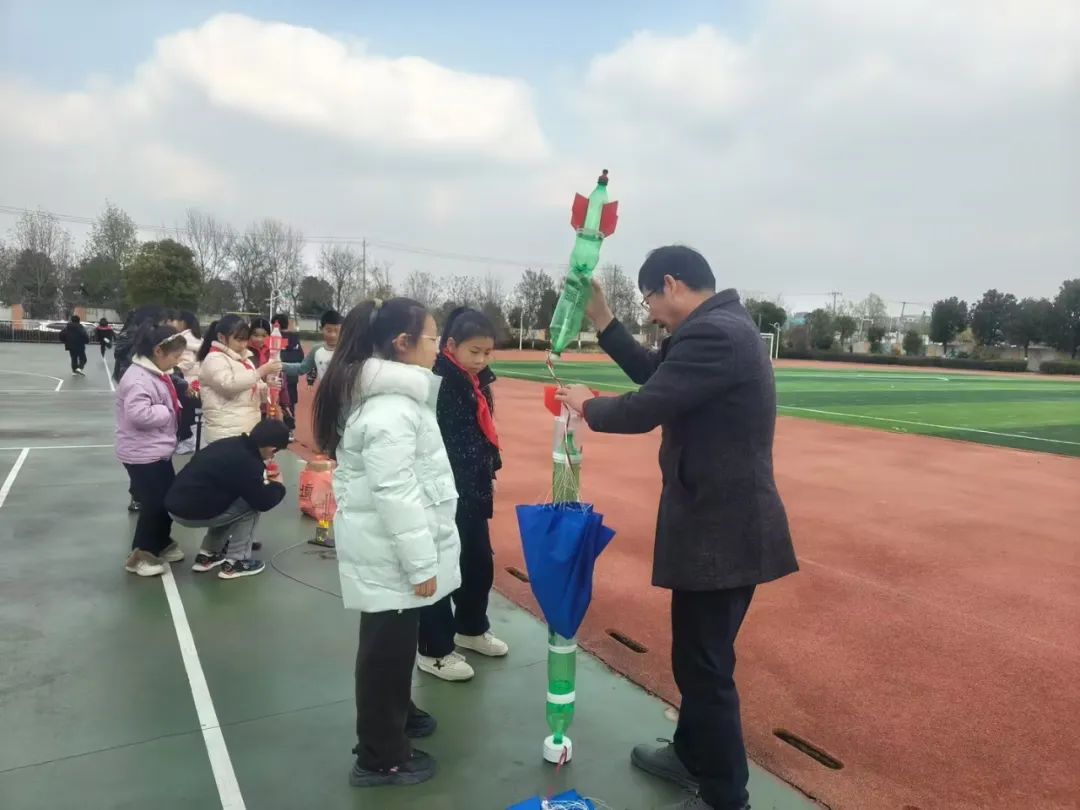 课间时分,学生们迫不及待地投入到水火箭的组装中。在老师的指导下,他们小心翼翼地将零件拼接在一起,每一道工序都凝聚着对科学的热爱与追求。组装完成后,学生们带着自己亲手制作的水火箭来到操场,随着一声令下,嗖的一声,第一枚水火箭喷射出强大的水流,水火箭升入空中,一级分离,打开降落伞,随着降落伞徐徐下降;二级接着上升一段距离后,打开降落伞,徐徐下降。现场响起了激动的欢呼声和热烈的掌声。随后,其他各组也依次进行了试射,水火箭在空中划出一道道美丽的弧线,仿佛在诉说着他们逐梦蓝天的决心与勇气。