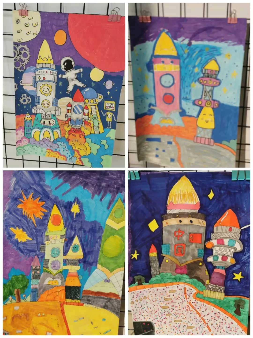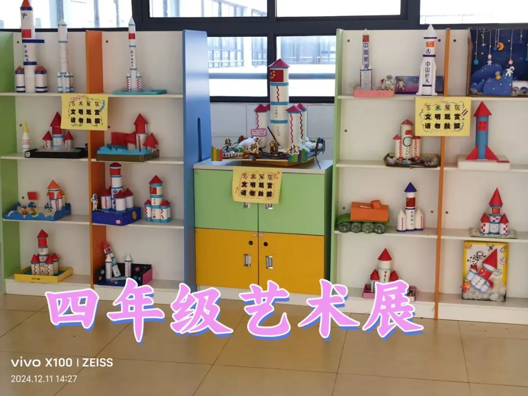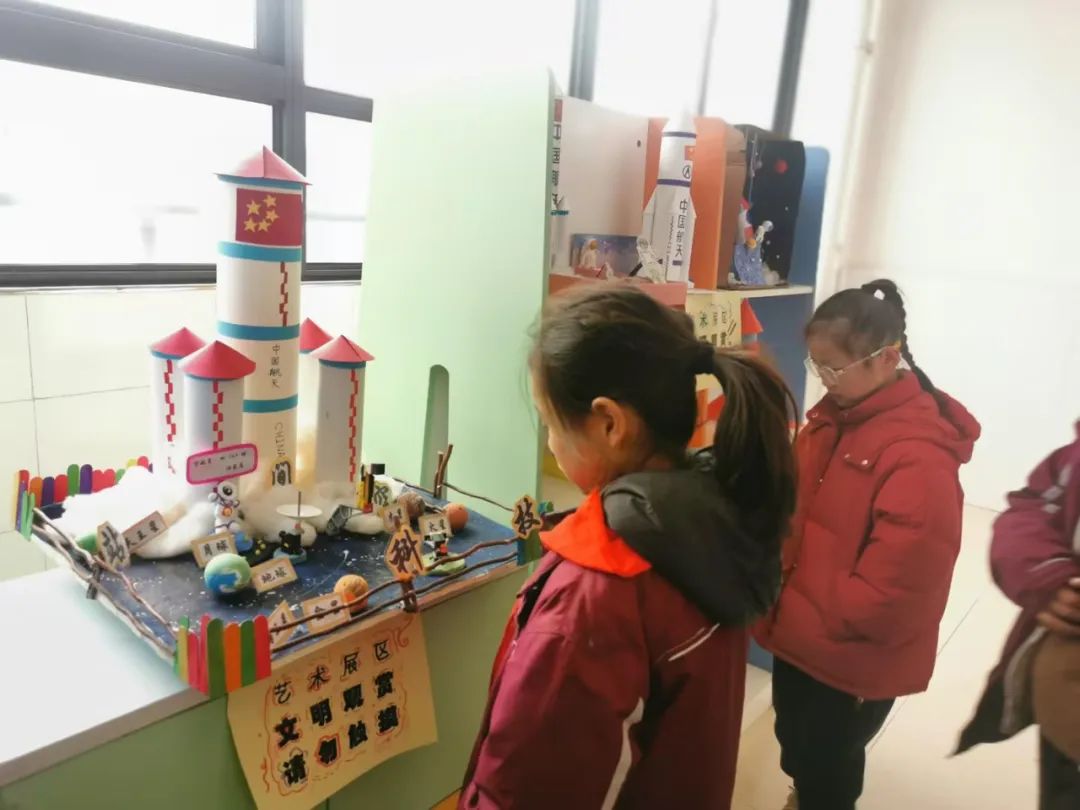 美术课上,钱乔钰老师们带领学生们进入了另一个奇妙的世界——火箭模型的制作指导与科幻画的绘制。学生们发挥想象力,用灵巧的双手制作出一个个栩栩如生的火箭模型,每一款都独具匠心,彰显着他们的创造力与智慧。同时,学生们还拿起画笔,在画纸上描绘出他们心中的火箭与太空世界,一幅幅色彩斑斓、充满想象力的科幻画在班级文化墙上绽放光彩,成为了校园里一道亮丽的风景线。