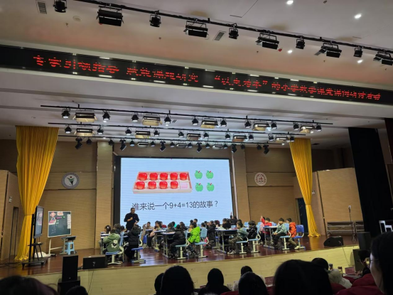 第二节课由安徽省特级教师郑朝晖老师带来了一堂生动有趣的一年级课《9加几》。课堂上,郑老师以“凑十法”为核心教学思路,摒弃传统灌输式教学模式,将抽象的数学计算与直观的实物图示相结合。课程中让学生分苹果、摆小方块等教具的引入,让学生直观感知“凑十”的过程。鼓励学生创编生活中的数学故事,这种“故事化”教学不仅衔接了算理与生活,更让学生在表达中巩固认知,体现了评价融入教学过程的生态课堂理念。在圈一圈、算一算、推一推等互动环节,充分调动了学生的动手能力与思维积极性,让学生在自主探究中掌握计算方法,真正成为课堂的主人。